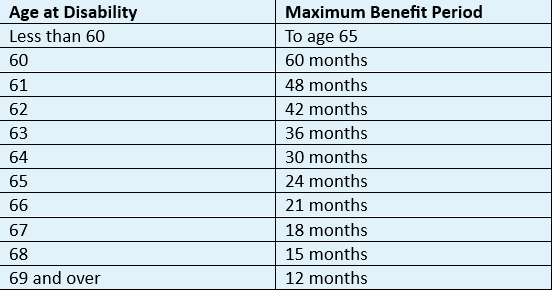 The maximum benefit period is the maximum length of time for which benefits are payable under the plan, as long as you remain continuously disabled. The duration depends on your age at disability: ![]() |